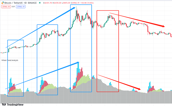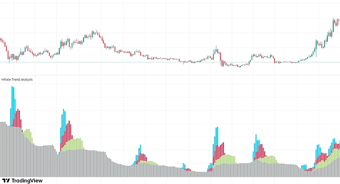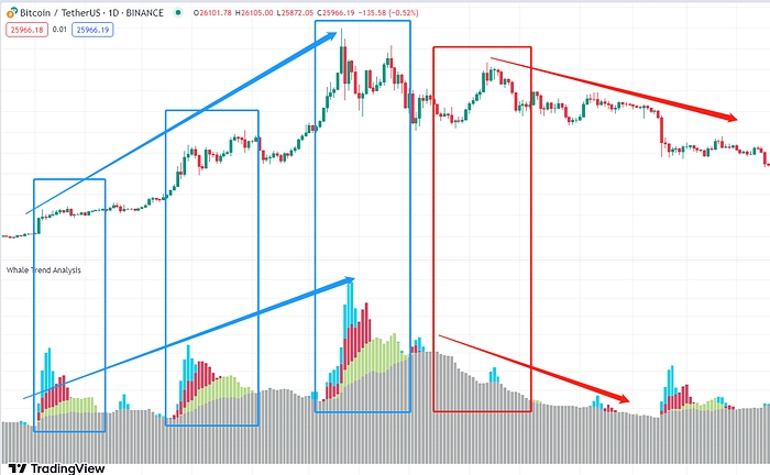 Identifying Trends: When the market is on the rise and there are bars representing institutional investors and market whales, it indicates strong buying intentions. However, if the market continues to rise but these bars disappear, it’s possible that only retail participants are actively trading, while institutional investors and market whales may be quietly exiting. In such a scenario, caution is advised to avoid being taken advantage of.